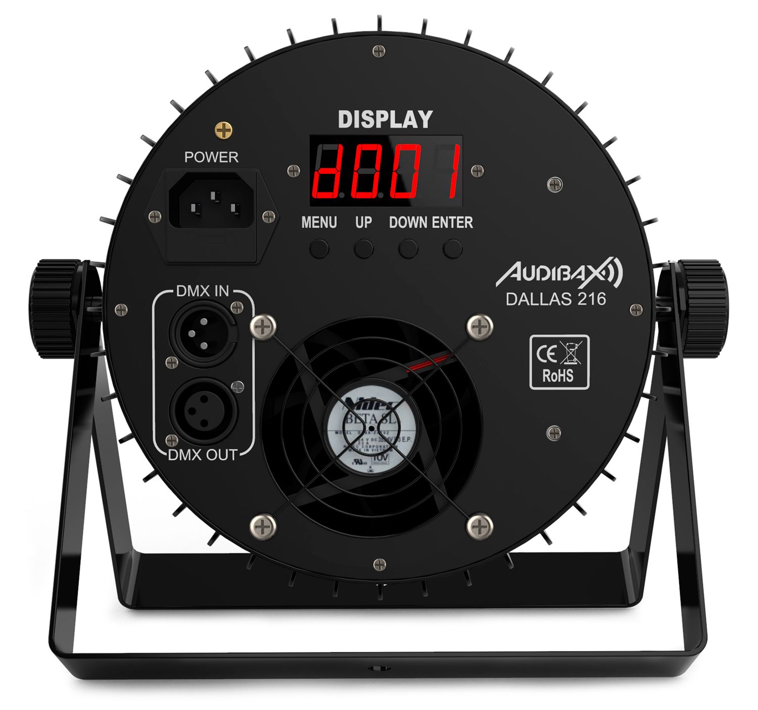 El Dallas 216 ofrece 2 modos DMX con numerosas funciones y programas incorporados, y cuenta con un micrófono integrado para la activación por sonido. Funciona en modo maestro, esclavo y autónomo y la pantalla iluminada permite con los 4 botones realizar ajustes fácilmente.