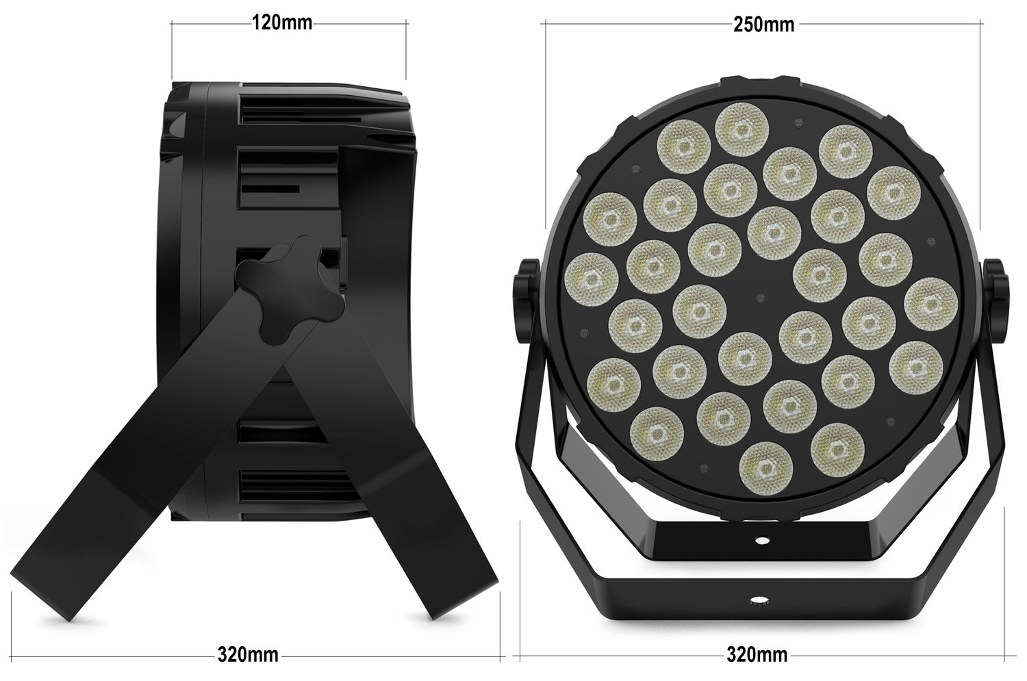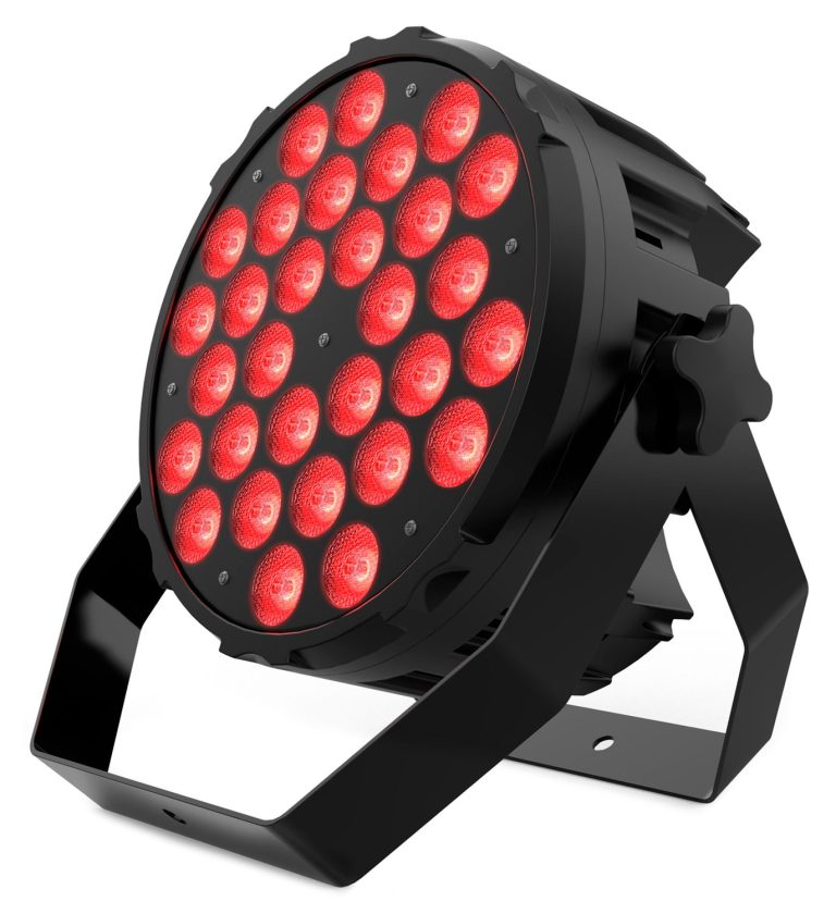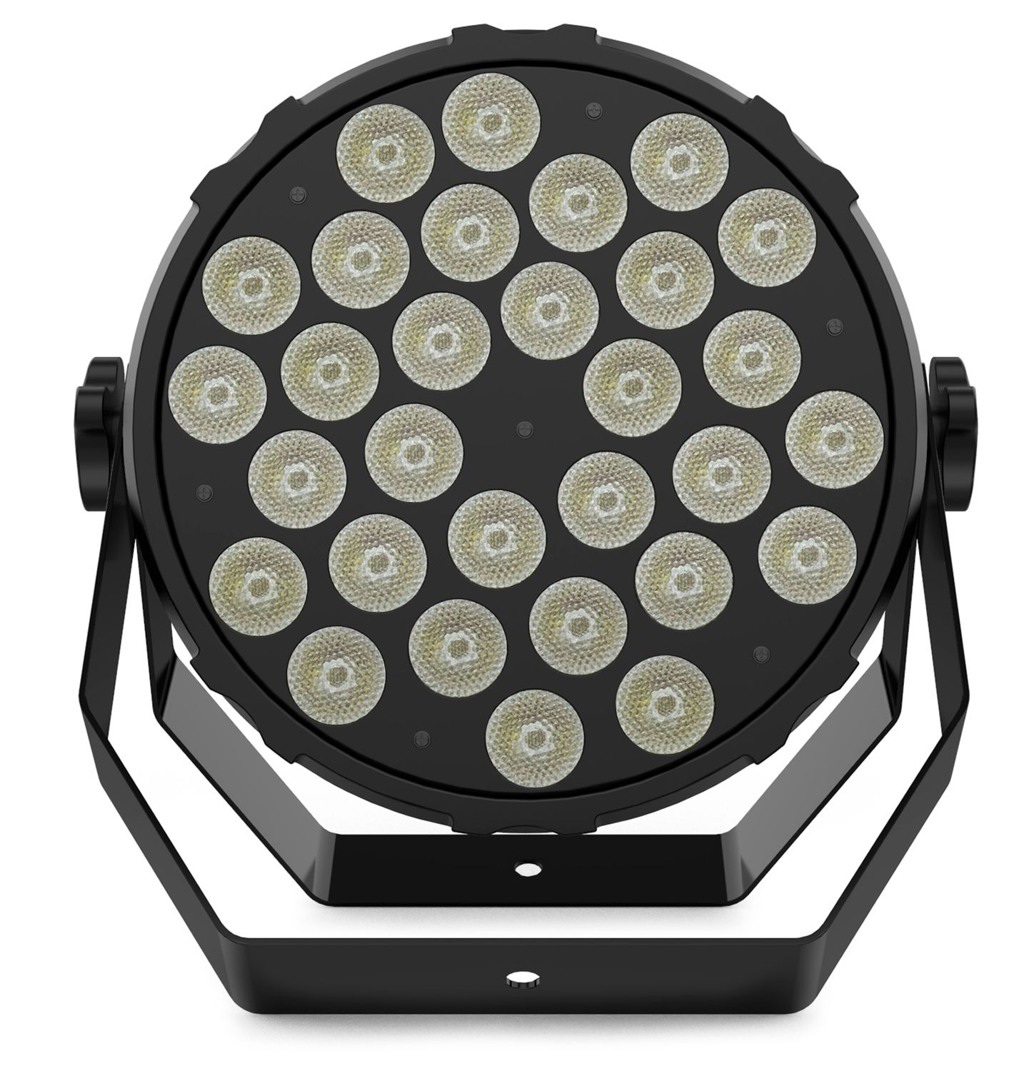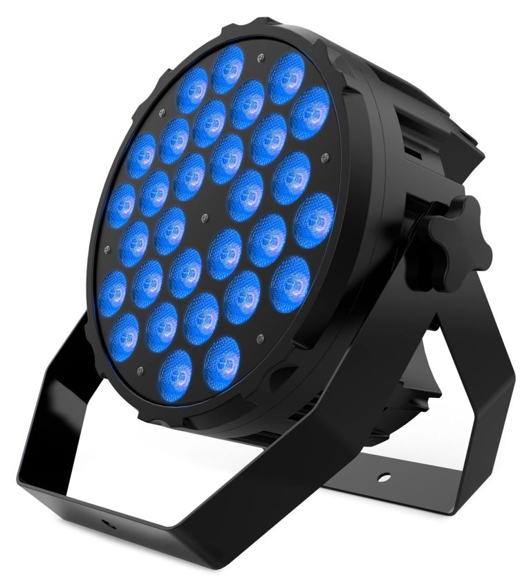 Los 30 LEDs de 10 W de alta eficiencia permiten obtener una amplia gama de colores RGBW, desde suaves tonos hasta tonos cálidos y muy saturados, con un ángulo de proyección de 30° y un alto nivel de iluminación. Su funcionamiento es muy silencioso gracias a la ventilación silenciosa.