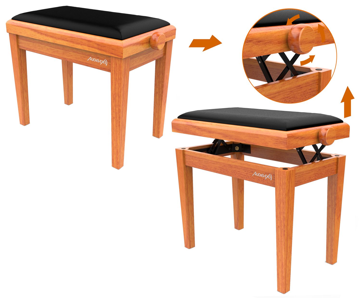 La Audibax KB600 Oak es muy robusta debido a la calidad de sus material, proporcionando una larga vida útil de la banqueta. Además, cuenta con un mecanismo de ajuste de altura que garantiza una gran comodidad y hace que sea un producto válido para casi todos los pianos y teclados y para todas las edades.