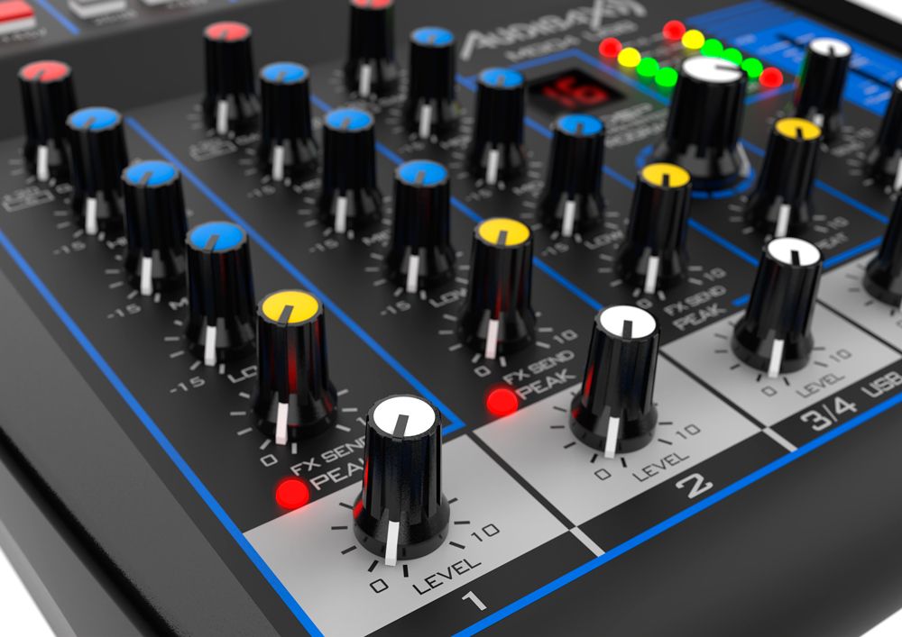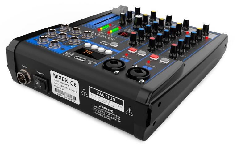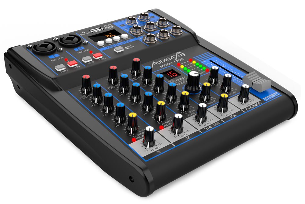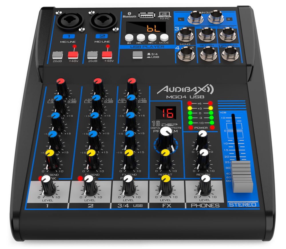 Audibax MG04-USB es una mesa de mezclas con conexión Bluetooth, Reproducción de MP3, con controles rotativos de gran precisión y tarjeta de sonido interna (no compatible con MacOS).