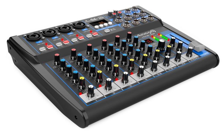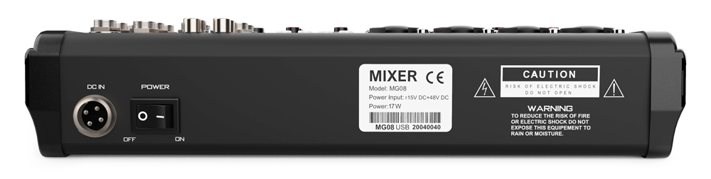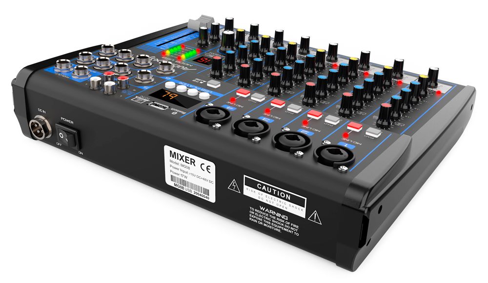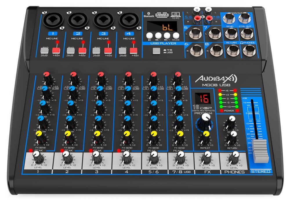 Audibax MG08-USB es una mesa de mezclas con conexión Bluetooth, Reproducción de MP3, con controles rotativos de gran precisión y tarjeta de sonido interna (no compatible con MacOS).