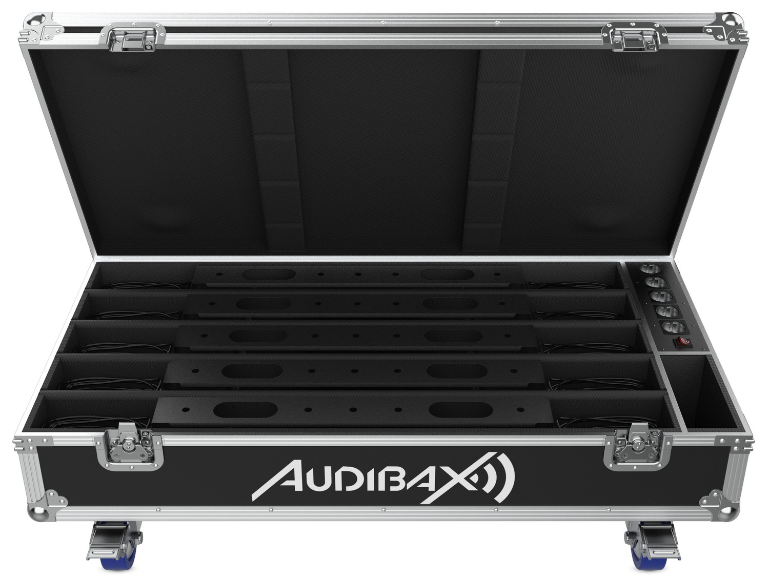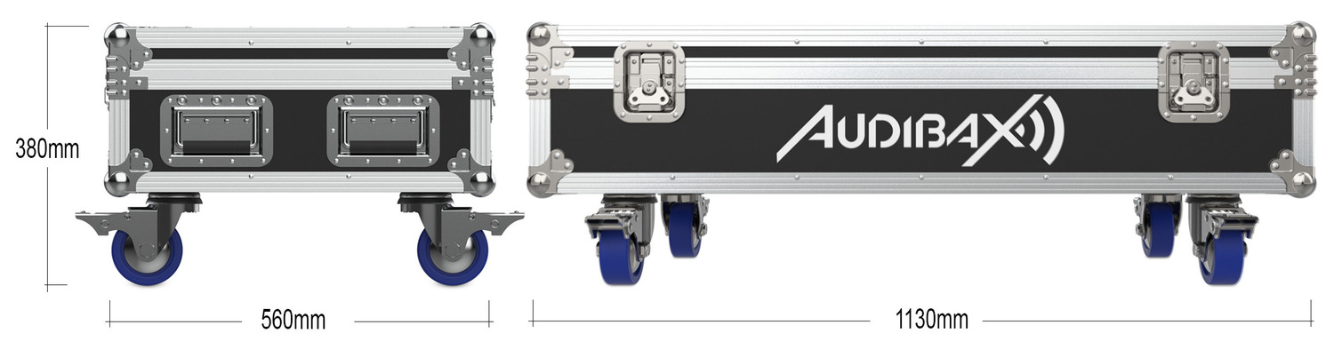 Kit composé de 5 unités de la Audibax Bar Event 1212 RGBWAUV et d’une Flight Case sur mesure.
