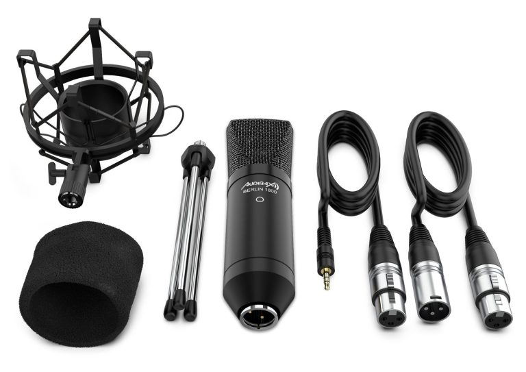 • Kit composé de: 1 microphone Berlin 1800, 1 bonnette anti-vent en mousse, 1 pied anti-vibration (araignée), trépied de bureau, câble XLR-XLR (2,5m), câble XLR-Mini Jack (2,5m)