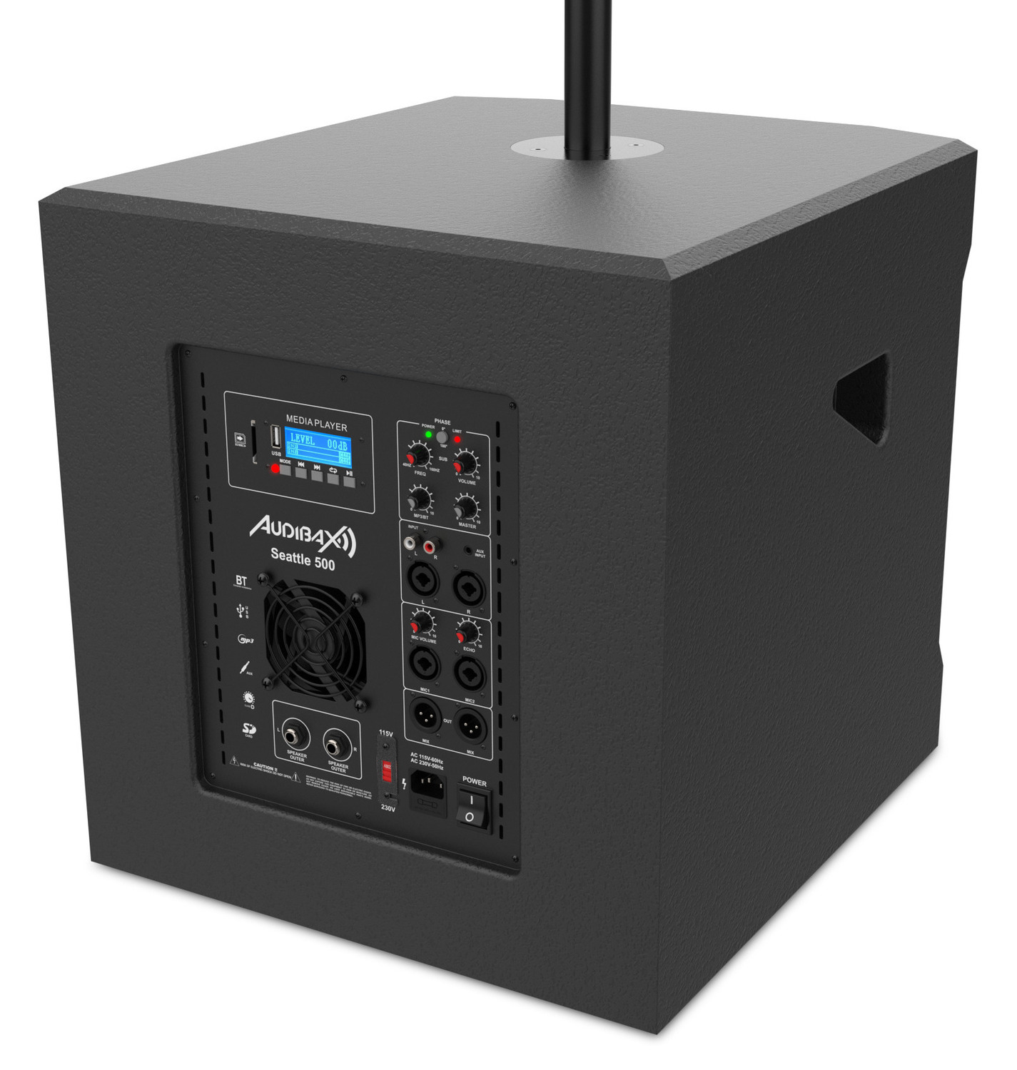 Notre Seattle 500 PA system dispose d’une entrée combo XLR / Jack gauche / droite, d’une entrée RCA symétrique, de 2 sorties XLR et de 2 sorties Speakon.