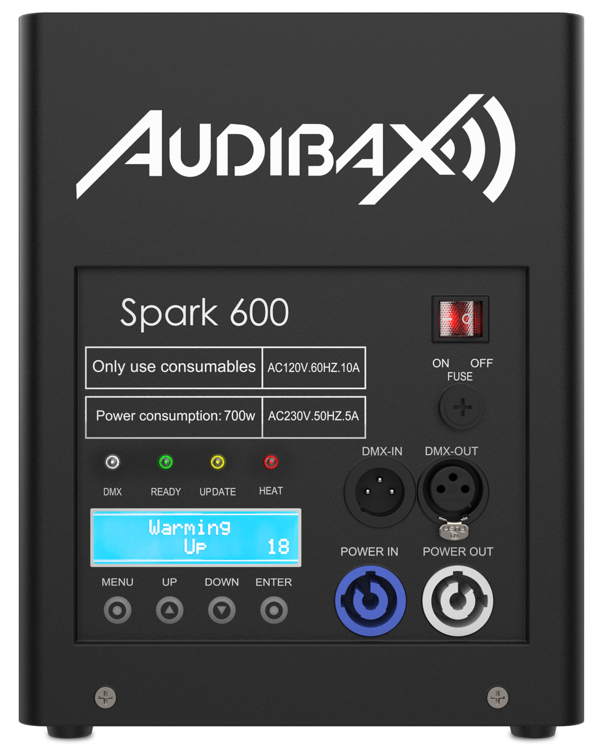 • Le Audibax Spark 600 est un máqiuna à feu froid qui génère des étincelles pouvant atteindre 2 – 4 mètres de hauteur, vous permettant de donner à vos événements et spectacles un aspect complètement différent.Le Audibax Spark 600 est un brouillard à feu froid qui génère des étincelles pouvant atteindre 2 à 4 mètres de hauteur, ce qui vous permet de donner à vos événements et à vos spectacles un aspect complètement différent.